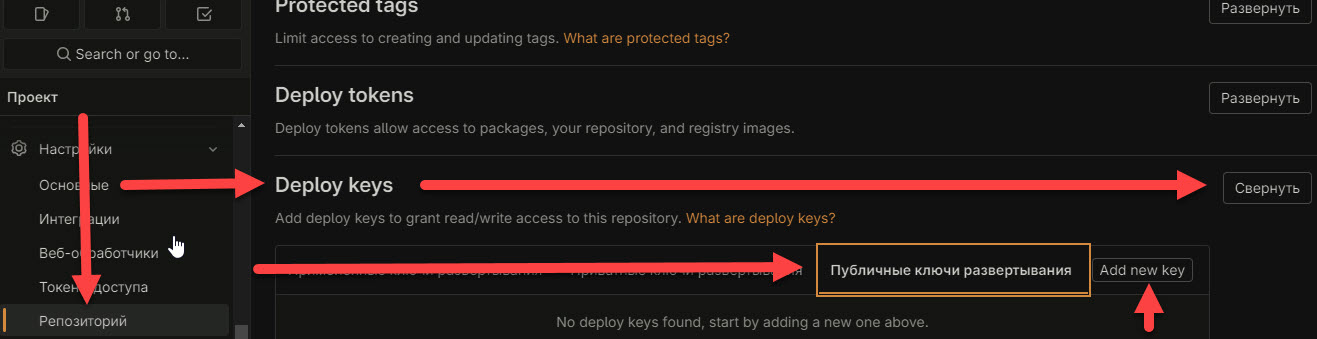 Аналогично можно добавлять ключи развертывания в общем Dashboard "Admin Area/Deploy Keys" и позже "Enable" их в необходимых репозиториях.