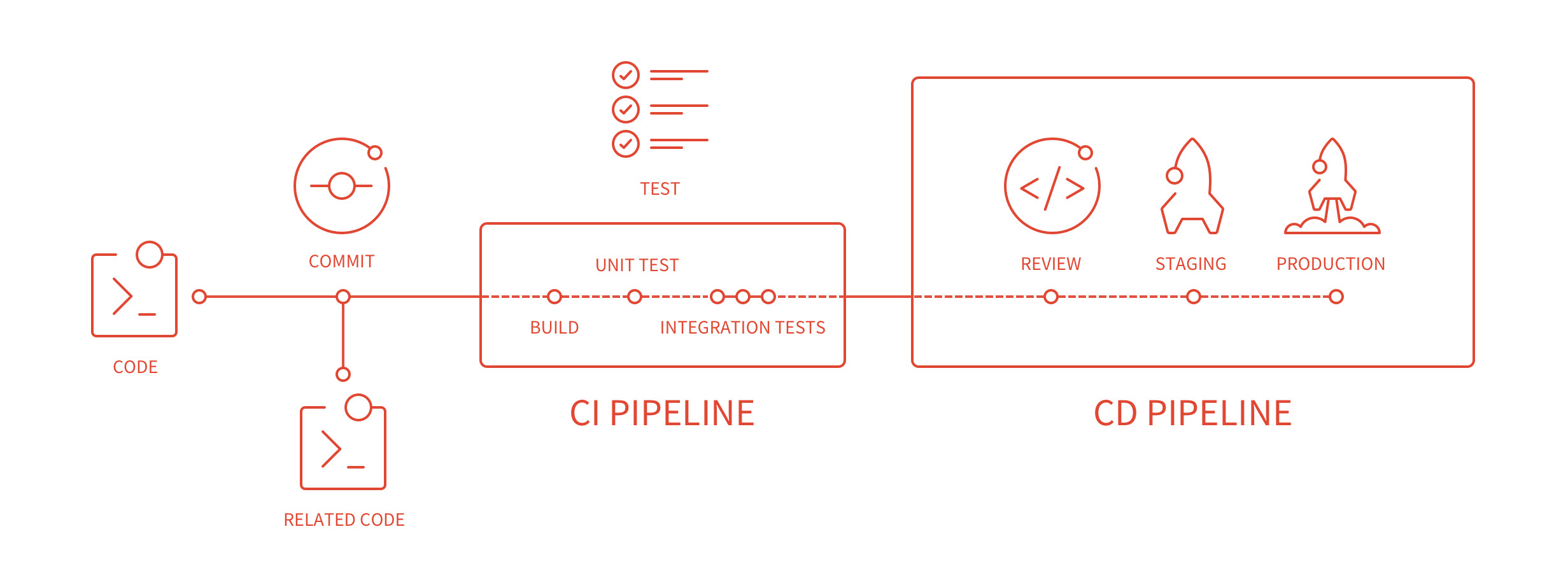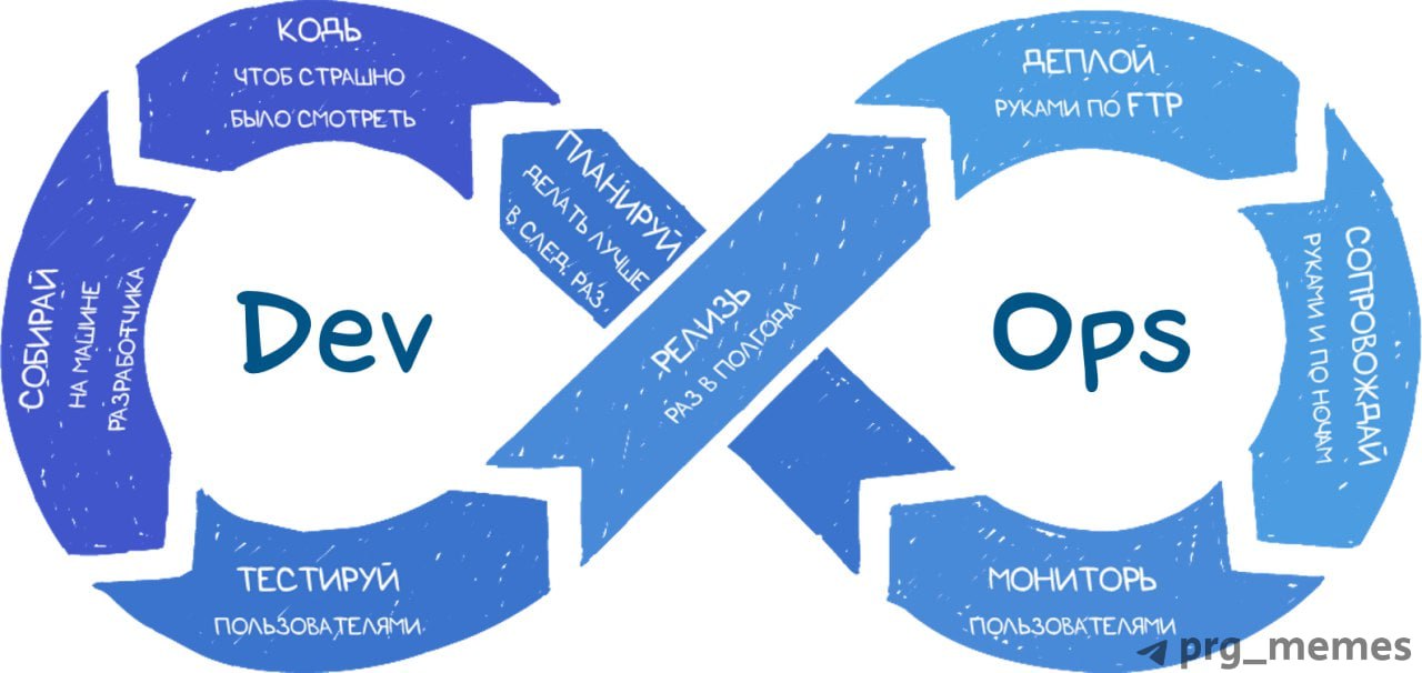 Все это происходит параллельно со многими задачами, потому что правильно настроенный CI/CD процесс гарантирует, что ничего не сломается, когда все будут запушивать свой код. Раньше все делали ручками: сливали код, тесты запускали тоже вручную, ну и развернуть все это на серваках тоже было той еще задачей. Вся эта петрушка была гораздо дольше и релизить было сложнее и трудозатратнее, а релизы были реже и больше. CI/CD, кстати, хорошо работает с модными нынче методологиями Скрам (Scrum) и Аджайл (Aglie), когда мы быстро выпускаем какую-то фичу, быстро разворачиваем, быстро получаем обратную связь и по жопе, если конечный пользователь недоволен, и затем все по новой. Поэтому, CI/CD часто на картинках изображают в виде петли.